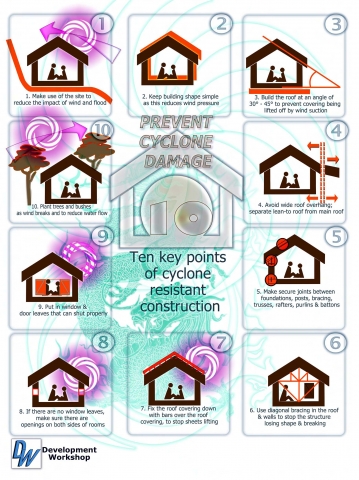 The adpated ten key principels for preventing cyclone damage to buildings used in Myanmar since 2008 with the Save the Children Alliance.Poster used in Myanmar |
