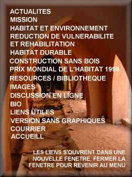 ACCUEILL Ecrivez Nous Version Sans Graphiques Des Liens Utiles Biographies Discussion en Ligne Bibliothèque d'images Resources et Bibliothèque à télécharger Le Prix Mondial de l'Habitat 1998 Construction Sans Bois Habitat Durable Réduction de Vulnérabilité et rehabilitation Habitat et Environnement Notre Mission Les Actualités